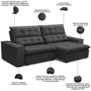 Sofá Retrátil Reclinável Para Sala 3 Lugares 250cm Vincent F04 Veludo Cinza Escuro - Lyam Decor