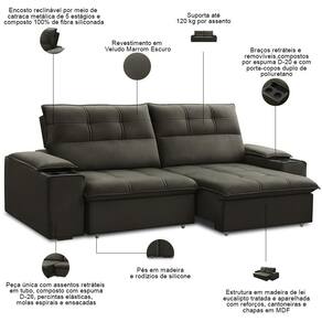Formato do sofá: Linear | Estilo: Moderno | Fabricante: Lyam Decor | Desenho do tecido: Liso | Densidade da espuma do assento: D-26 | Largura: 250 cm | Cor dos pés: Marrom | Profundidade: 98 cm | Quantidade de Caixas de embalagem: 1 | Peso: 80 Kg | Requer montagem: Não | Tipo de produto: Sofá Retrátil Reclinável | Cor: Marrom Escuro | Unidades por kit: 1 | Altura: 110 cm | Material do estofamento: Veludo | Mecanismo de abertura do produto: Manual, rodízios de silicone | Material de enchimento do encosto: Fibra Siliconada | Orientação do Sofá: Frontal | Linha: Sala de Estar | Peso máximo suportado: 240 kg
