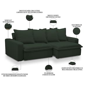 Encosto reclinável por meio de catraca metálica com 5 estágios e almofadas soltas 100% em fibra siliconada.