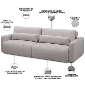 Encosto reclinável por meio de catraca metálica com 5 estágios e almofadas soltas 100% em fibra siliconada.