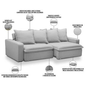 Encosto reclinável por meio de catraca metálica com 5 estágios e almofadas soltas 100% em fibra siliconada.