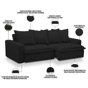 Encosto reclinável por meio de catraca metálica com 5 estágios e almofadas soltas 100% em fibra siliconada.