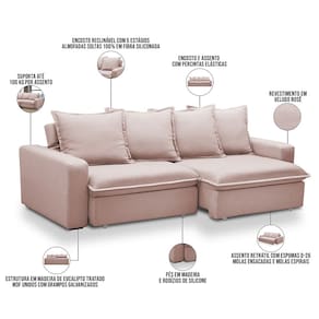 Encosto reclinável por meio de catraca metálica com 5 estágios e almofadas soltas 100% em fibra siliconada.