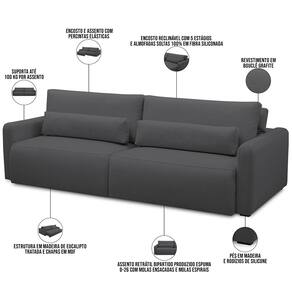Encosto reclinável por meio de catraca metálica com 5 estágios e almofadas soltas 100% em fibra siliconada.