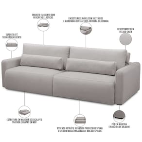 Encosto reclinável por meio de catraca metálica com 5 estágios e almofadas soltas 100% em fibra siliconada.