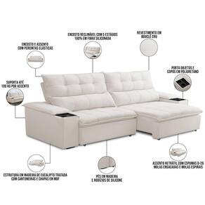 Altura: 110 cm | Color: Branco | ColorFamily: Branco | ColorSimple: Branco | ColorSupplier: Cru | Cor: CRU | Cor dos pés: -1 | Densidade da espuma do assento: D-26 | Desenho do tecido: Liso | Estilo: Moderno | Fabricante: Lyam Decor | Formato do sofá: Linear | Largura: 250 cm | Linha: Sala de Estar, Living | Material: Madeira de lei (Eucalipto) devidamente tratada e aparelhada com reforços e cantoneiras e chapas em M | Material de enchimento do encosto: 100% em fibra siliconada. | Material do estofamento: Bouclê | MaterialFamily: Tecido, Madeira | Mecanismo de abertura do produto: -1 | Model: Ártico | Orientação do Sofá: -1 | OriginCountry: Nacional | OriginState: PR | Peso: 80 Kg | Peso máximo suportado: 100 kg | ProductContents: 01 Sofá | ProductHeight: 250 cm | ProductInstructions: Produto para uso em ambiente interno, nao devendo ficar exposto ao sol, calor e umidade excessivos. | ProductLength: 98 cm | ProductWarranty: 90 dias após o recebimento do produto | ProductWeight: 80 kg | ProductWidth: 110 cm | Profundidade: 98 cm | Quantidade de Caixas de embalagem: 1 | Requer montagem: Não | SizeDescription: Altura: 110 cm x Largura: 250 cm x Profundidade: 95 cm | SupplierSimpleName: Sofá Retrátil Reclinável Para Sala de Estar Living 250cm Ártico F04 Bouclê Cru - Lyam Decor | Tipo de produto: Sofá | Unidades por kit: 1