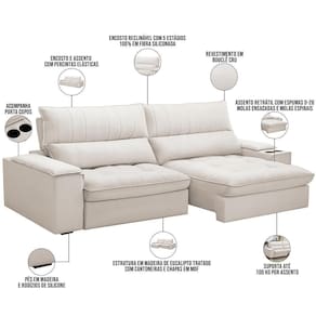 Altura: 115 cm | Color: Branco | ColorFamily: Branco | ColorSimple: Branco | ColorSupplier: Cru | Cor: CRU | Cor dos pés: -1 | Densidade da espuma do assento: D-26 | Desenho do tecido: Liso | Estilo: Moderno | Fabricante: Lyam Decor | Formato do sofá: Linear | Largura: 280 cm | Linha: Sala de Estar, Living | Material: Madeira de lei (Eucalipto) devidamente tratada e aparelhada com reforços e cantoneiras e chapas em M | Material de enchimento do encosto: 100% de Fibra Siliconada | Material do estofamento: Bouclê | MaterialFamily: Tecido, Madeira | Mecanismo de abertura do produto: -1 | Model: Nápoles | Orientação do Sofá: -1 | OriginCountry: Nacional | OriginState: PR | Peso: 110 kg | Peso máximo suportado: 100 kg | ProductContents: 01 Sofá | ProductHeight: 280 cm | ProductInstructions: Produto para uso em ambiente interno, nao devendo ficar exposto ao sol, calor e umidade excessivos. | ProductLength: 110 cm | ProductWarranty: 90 dias após o recebimento do produto | ProductWeight: 110 kg | ProductWidth: 115 cm | Profundidade: 110 cm | Quantidade de Caixas de embalagem: 1 | Requer montagem: Não | SizeDescription: Altura: 115 cm x Largura: 280 cm x Profundidade: 96 cm | SupplierSimpleName: Sofá Retrátil Reclinável Para Sala de Estar Living 280cm Nápoles F04 Bouclê Cru - Lyam Decor | Tipo de produto: Sofá | Unidades por kit: 1