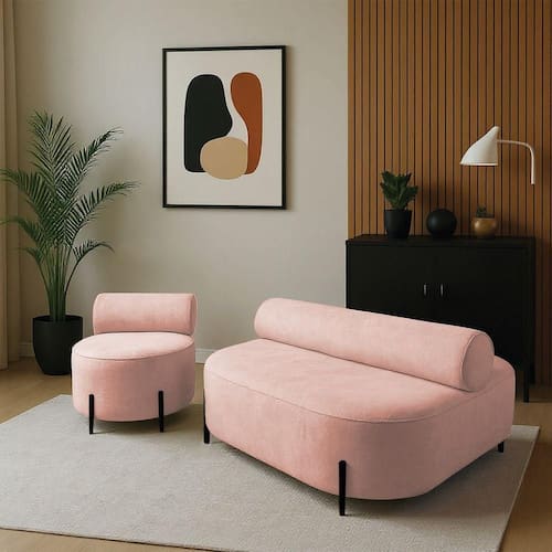 Sofá Sala Ilha Orgânico E 1 Poltrona 125cm éden Pé Aço Preto Bouclê Rosê E03 - D'rossi Transforme seu ambiente com o Kit Sofá Ilha e 1 Poltrona Éden em Bouclê Rosê, uma peça de design orgânico que une estética moderna, conforto superior e presença decorativa marcante. Seu formato arredondado com encosto cilíndrico (rolinho) adiciona delicadeza ao visual da peça. Produzido com estrutura em madeira de eucalipto e MDF, o conjunto orgânico oferece resistência e longa durabilidade. O assento em espuma D-33 proporciona sustentação e maciez ideais para uso diário, enquanto o encosto rolo em espuma D-26 com fibra 100% garante apoio confortável e ergonômico. Outro grande diferencial tanto da poltrona quanto o sofá curvo é o estilo leve e fluido, perfeito para locais que pedem sofisticação, como salas de estar, lofts, áreas de convivência e até projetos corporativos que necessitam de um sofá para recepção ou sofá lounge. Os pés laterais em aço preto reforçam a robustez estrutural e adicionam um toque natural à peça. O kit Éden transforma qualquer espaço em um ambiente acolhedor. Dimensões do Sofá: