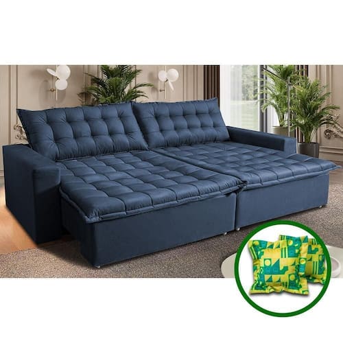 Sofá Sem Caixa Retrátil Reclinável 2,75m Cama Inbox França Velusoft Azul
