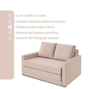 Assentos com espuma flexível de poliuretano densidade 26kg/m, certificada, fabricação própria. Com assento dobráveis, ela abre totalmente virando uma cama. Enchimento do encosto: espuma D-26 e fibra de poliéster siliconada. Estrutura de madeira maciça de pinus e eucalipto 100% reflorestada. Fixação da estrutura: grampos galvanizados anti-ferrugem. Apoiados no chão com sapatas de pvc. Revestimento/tecido: veludo 100% poliéster, com toque macio.