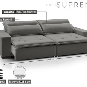 O sofá Supre-me foi cuidadosamente projetado para proporcionar o máximo conforto aos amantes de ambientes personalizados, permitindo que você monte sua casa conforme sua preferência, com uma variedade de cores e composições disponíveis. Sua estrutura garante conforto excepcional, graças à espuma macia combinada com percinta elástica, proporcionando uma superfície agradável ao toque. Além disso, o encosto é preenchido com uma combinação de espuma, garantindo apoio adequado e conforto prolongado. Este produto exclusivo é versátil e está alinhado com as tendências de design tanto internacionais quanto europeias. Produto Montado: Não Acompanha Almofadas extras: Não Almofada do assento: Fixa Almofada do encosto: Fixa Altura do assento até o chão: 46.0000 Altura do Braço: 60 cm Altura do Encosto: 60 cm Altura dos Pés: 5 cm Ambiente Principal: Sala de Estar codigo_ean: 7909903896105 Consistência do Assento: Macio Cor: Cinza Cor do Produto: Cinza Densidade do Assento: D-28 Enchimento do Assento: Espuma Enchimento do Encosto: Fibra Siliconada Firmeza do Assento: Macio Informações Complementares: Não Itens Inclusos: 01 Sofá Largura do Sofá Maior: 260 cm Linha ou Coleção: Não Material dos Pés: Madeira Montagem Flex: Não Necessita Montagem: Não Nível de Conforto: Confortável Origem do Produto: Nacional Peso: 84,5 kg Pet Friendly: Não Possui Percintas Elásticas: Sim Possui Pés: 08 Possui Rodízio: Sim Profundidade Quando Estendido: cm Recomendações de Uso, Manutenção e Limpeza: Não Rodízio com Trava: Não Suporta Até (kg): 120 kg Tecido Predominante: Linho Tipo de Encosto: Regulável Marca: ESTOFADOS GRAFANI