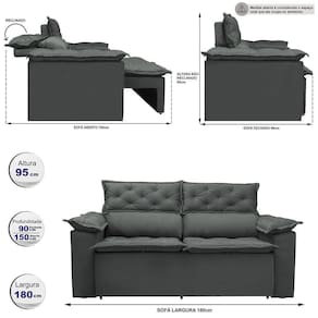 Ele possui encosto reclinável em cinco posições, proporcionando-lhe mais conforto na hora do descanso. E não para por aí: seu assento retrátil conta com espuma D28 e molas espirais, transformando seu sofá em uma verdadeira cama para assistir seu filme preferido.