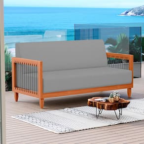 Madeira maciça, linho, corda náutica, espuma HR-23/HR-26, plumante de siliconeQue tal o Sofá Varanda Samoa Madeira Maciça 02 Lugares com Cordas Náutica?