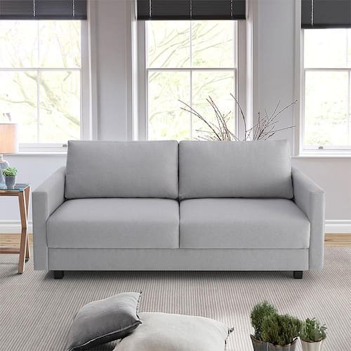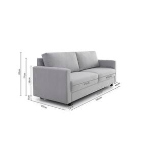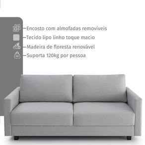 Assentos com espuma flexível de poliuretano densidade 26kg/m, certificada, fabricação própria, coladas sobre molas ensacadas, sustentados por persintas elásticas. Enchimento do encosto: fibra siliconada. Estrutura de madeira maciça de pinus e eucalipto 100% reflorestada. Fixação da estrutura: grampos galvanizados anti-ferrugem. Apoiados no chão com pés de madeira 8cm. Revestimento/tecido: linho 100% poliéster, com toque macio.
