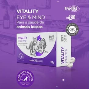 O soft care nutri vitality eye & mind é um suplemento para cães e gatos, especialmente idosos, que auxilia na saúde cognitiva e ocular. Contém dha, epa, coenzima q10, luteína e zeaxantina. Deve ser administrado 1 comprimido por dia para cada 5 kg de peso corporal. Embalagem com 30 comprimidos 3 cartelas de 10 .