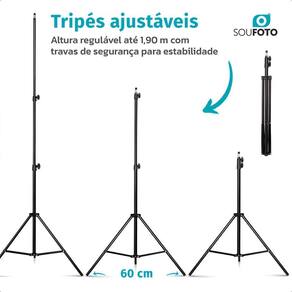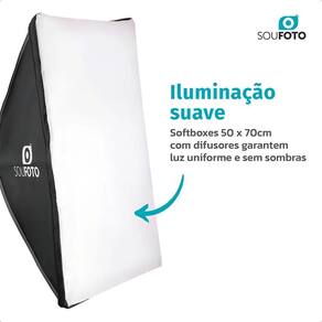 Eleve suas fotos e vídeos a outro nível Transforme suas criações com a iluminação suave e uniforme que só o Kit Duplo Softbox 50x70cm Sou Foto oferece, capturando a essência de cada detalhe. Iluminação que Impressiona: Luz Suave e Sem Sombra: A tela difusora do softbox elimina reflexos indesejados e sombras duras, realçando a beleza natural em retratos, produtos e muito mais. Versatilidade Incomparável: Perfeito para estúdios fotográficos, gravações de vídeo, transmissões lives , ensaios newborn, moda e qualquer projeto que exija iluminação de alta qualidade. Montagem Rápida e Transporte Fácil: Com design leve e dobrável, o kit se monta em segundos e é compacto para levar para qualquer lugar. Compatibilidade Total: Soquete E27 universal para usar suas lâmpadas LED ou fluorescentes favoritas não inclusas . Ajuste Perfeito: Tripés robustos de até 2 metros com travas seguras para posicionar a luz exatamente onde você precisa. O Que Você Recebe: 2x Softbox Sou Foto 50x70cm com soquete E27 e tela difusora 2x Tripé de Iluminação Sou Foto TPI-200 até 2m de altura Especificações Técnicas Detalhadas: Marca: Sou Foto Modelo: Kit Duplo Chicago Materiais: Alumínio reforçado, plástico ABS, nylon de alta resistência Dimensões: Softbox: 50x70cm; Tripé: Regulagem de altura até 2m 68cm fechado Peso Total: 3,1kg Conexão da Lâmpada: Soquete E27 lâmpadas não inclusas Voltagem: Bivolt 110V220V - dependente da lâmpada utilizada Uso Ideal: Fotografia de produto, retratos, vídeos, lives, moda, newborn, estúdio. Não perca a chance de elevar o padrão das suas produções. Adquira agora o seu Kit Duplo Softbox Sou Foto e veja a diferença