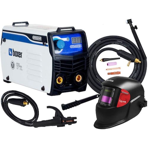Acompanhando a Máquina de Solda Touch 145 Boxer, você receberá uma máscara de solda plástica básica para sua proteção, uma máscara de Escurecimento Automático para maior comodidade, uma tocha Tig Seca Completa, um cabo com garra negativa, um cabo com porta eletrodo e uma escova/picador de solda.