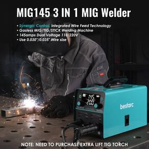 bestarc Soldador MIG 145A, máquina de solda Synergic MIG145 5GEN 3 em 1 Synergic MIG145 5GEN, soldador de fluxo portátil com tela digital - Soldador 3 em 1: o soldador MIG145 MIG tem multifuncional para MIG, Lift TIG e Stick. A corrente máxima é de 145 amperes, suporta fio mig com núcleo de fluxo de 0,1 cm/0,1 cm. O soldador mig sem gás se destaca na soldagem de aço inoxidável, aço carbono e até mesmo aço mais espesso, atendendo a diversas necessidades de soldagem. Vem com uma lanterna MIG removível de 2,5 m de comprimento para portabilidade. (É necessário comprar maçarico Lift Tig extra) - Tela digital: Projetamos esta máquina de solda MIG com tecnologia totalmente nova. Soldador MIG 110 V/220 V com tela digital LED voltagem, corrente e outros parâmetros. Você não precisa remover o capacete para avaliar o status do equipamento. Você pode fazer ajustes em tempo real, melhorando a eficiência e a precisão - Controle sinérgico: o soldador 3 em 1 adota IGBT e tecnologia de alimentação de fio integrada para corresponder automaticamente à tensão recomendada e velocidade de alimentação do fio (corrente). Ao mesmo tempo, o usuário também pode pressionar o botão de ajuste para ajustar individualmente a tensão ± 3 V, tornando-o acessível para iniciantes e profissionais - Dupla voltagem de 110/220 V: o soldador mig sem gás suporta tensão dupla de 110/220V, identificando automaticamente a tensão de entrada e exibindo claramente através do indicador do painel frontal. Este design permite que o soldador MIG funcione perfeitamente em diferentes ambientes de energia, proporcionando maior conveniência e aplicabilidade - O pacote inclui: 1 × máquina de solda MIG145 MIG, 1 × tocha MIG de 20 pés, 1 grampo de terra, 1 suporte de vara, 1 × fio com núcleo de fluxo de 0,76 cm, 2 × ponta de contato, 1 adaptador de fio de 220 V a 110 V, 1 escova de arame, 3 × haste de soldagem, 1 x manual do usuário