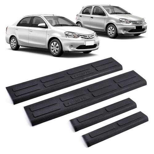 A soleira injetada desenvolvida pela camper, produto fabricado especialmente para seu veículo, sem que ocorra a danificação do produto devido ao fluxo de motorista e passageiros, no ato do embarque e desembarque. Além de sua importância na conservação. Produto fabricado em plástico injetado em alta qualidade e durabilidade, possui textura antiderrapante, proporcionando assim maior segurança, conta com excelente acabamento personalizado. Além de ser produzido com encaixe perfeito para seu veículo, instalado sobre superfície limpa e seca, garantindo a melhor fixação do produto. Especificações: produto na cor preto. Fabricadas em plástico injetado. Fácil instalação. Textura antiderrapante. Fixação por fita 3m dupla face. Possui 4 peças. Medidas da soleira dianteira: 45 cm x 5 cm. Medidas da soleira traseira: 23,5 cm x 5 cm. Conteúdo da embalagem: 02 - soleiras dianteiras. 02 - soleiras traseiras. Compatível com: etios 2013 à 2021. compatível para todas as versões hatch e sedan . Garantia de 03 meses, contra defeitos de fabricação. Imagens ilustrativas. Recomendamos que a instalação seja realizada por um profissional. ----------------------------- -----------------------------