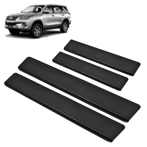sobre o produto: pelo fato de ser produzida em alumínio, esta soleira é super-resistente e não enferruja. A soleira de porta protege seu carro contra riscos, além de proporcionar um visual esportivo para o automóvel, pois é personalizado e fabricado sob medida para cada veículo com alto padrão de tecnologia e matéria prima. Especificação técnica: alta resistência. Pintura eletrostática na cor preta. Rigoroso controle de qualidade. Maior cobertura da área das soleiras. Corte e escrito em alto relevo. Identificação do modelo de cada soleira. Não deixa rebarba por ser cortado a laser. Fabricado em alumínio de 1mm de alta qualidade. Fixação por fita dupla face, a melhor do mercado. Tamanho dianteira: 50 cm x 8 cm cxa . Tamanho traseira: 38 cm x 8 cm cxa . Conteúdo da embalagem: 02 - soleiras dianteiras. 02 - soleiras traseiras. Compatível com: toyota hilux sw4 2016 à 2023. compatível para todas as versões