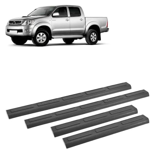 A soleira injetada desenvolvida pela camper, produto fabricado especialmente para seu veículo, sem que ocorra a danificação do produto devido ao fluxo de motorista e passageiros, no ato do embarque e desembarque. Além de sua importância na conservação. Produto fabricado em plástico injetado em alta qualidade e durabilidade, possui textura antiderrapante, proporcionando assim maior segurança, conta com excelente acabamento personalizado. Além de ser produzido com encaixe perfeito para seu veículo, instalado sobre superfície limpa e seca, garantindo a melhor fixação do produto. Especificações: produto na cor preto. Fabricadas em plástico injetado. Fácil instalação. Textura antiderrapante. Fixação por fita 3m dupla face. Possui 4 peças. Medidas da soleira dianteira: 56,5 cm x 4 cm. Medidas da soleira traseira: 34,5 cm x 4 cm. Conteúdo da embalagem: 02 - soleiras dianteiras. 02 - soleiras traseiras. Compatível com: hilux 2005 à 2015. compatível para todas as versões cabine dupla . Garantia de 03 meses, contra defeitos de fabricação. Imagens ilustrativas. Recomendamos que a instalação seja realizada por um profissional. ----------------------------- -----------------------------