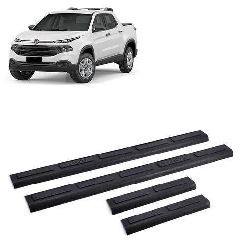 produto na cor preto. Fabricadas em plástico injetado. Fácil instalação. Textura antiderrapante. Fixação por fita 3m dupla face. Possui 4 peças. Medidas da soleira dianteira: 57 cm x 5 cm. Medidas da soleira traseira: 24 cm x 5 cm. Conteúdo da embalagem: