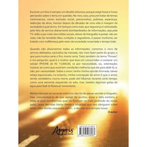 Escrever um livro é sempre um desafio doloroso, porque exige horas e horas pensando sobre o tema em questão. No meu caso, procurei tratar de temas controversos, como: exclusão social, preconceitos, pobreza, esperança, redenção da alma, mesmo depois de décadas de uma vida à margem da sociedade à qual serviu. Em tempos como este, que segurança é velocidade, pelo fato de sermos diariamente bombardeados de informações, seja pela TV, rádio e por meio das mídias sociais, deixar de fotografar e postar, não ser visto, não ter recebido likes, curtições e seguidores, é passar incólume, ser tratado com indiferença pelo resto da sociedade conectada o tempo todo. Quando não absorvemos todas as informações, corremos o risco de sermos deletados, excluídos da manada, não mais fazer parte do grupo, o que para muitos seria o fim; morte certa. Trato também do tema: “Posses”, e me pergunto, qual é o motivo que leva um consumidor a comprar um celular IPHONE de R$ 15.000,00, se por necessidade, ou, ostentação; mostrar ao outro que você tem condições melhores que ele para obtê-lo, e, não, por necessidade. Sobre o amor, tenho minha opinião formada, talvez esteja equivocado, no entanto, minha concepção de amor é que o amor, sendo verdadeiro, nunca morre, pode até hibernar durante certo tempo, como uma semente esquecida no solo, mas, bastam algumas gotas de água para fazê-lo florescer novamente. Minha intenção ao escrever este livro não foi de passar sermão a ninguém, mas, conscientizá-lo de que apesar de ocultos, amor e ódio existem, e estão aí para escolhermos qual irá florescer no mais profundo do nosso peito, quais decisões tomar frente a situações que nos obriguem sobre amor, ódio, direita, esquerda, enfim... a decisão será sempre nossa.