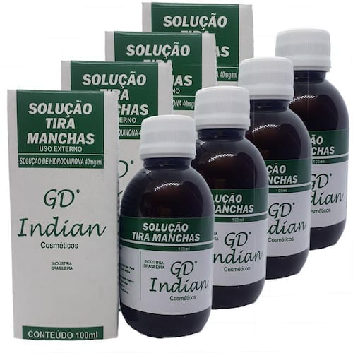 Solução Tira Manchas Escuras Da Pele Gd Indian 100MlIndicações: Hipercromia, Cloasma Gravídico, Manchas Escuras Causadas pelo Sol, Cravos e Espinhas.Contra Indicações: Mulheres Grávidas e Crianças.Precauções e Advertências: Evitar exposição ao sol, usar protetor solar, em caso de reação alérgica suspender o uso imediatamenteModo de Usar: Aplicar nas regiões afetada a noite; lavar na manhã seguinte e aplicar protetor solar FP25, recomenda-se o uso até as manchas desaparecer.Manter o frasco fechado e em local fresco.Res. Anvisa 343/05. Marca: Gd Indian