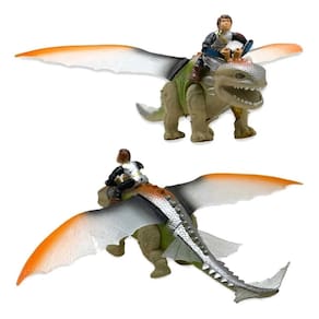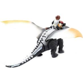 Dragão Anda para frente, acende as luzes, mexe a cauda e as asas, boneco pode ser removido do dragão.
