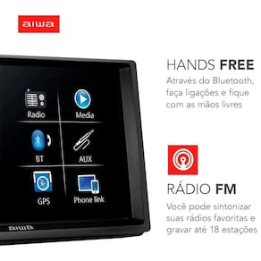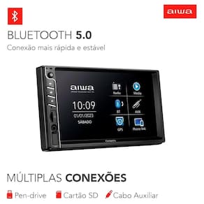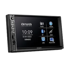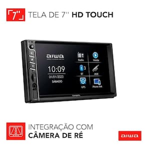 Especificações técnicas Características Principais do Produto: Altura: 10,40 cm Bluetooth: 5.0 Certificado Anatel: 14232-21-13976 Comprimento/Profundidade: 9,50 cm Cor: Preto Largura: 18 cm Marca: Aiwa Modelo: AWS-CA-DD-01 Peso: 460 g Potência (RMS): 100 W RMS (4 x 25W) Touch Screen: Sim Tela: 7 polegadas Resolução da tela: HD (1024 x 600 pixels)