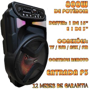- Duplo alto-falante: 1 de 15" e 1 de 3" com potência total de 800W de pura qualidade sonora;