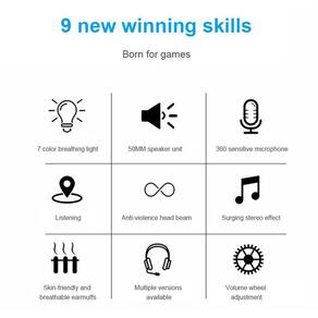 Características destacadas 1. Design leve: confortável e fácil de usar, então você mal consegue sentir o peso de sua cabeça ao jogar, e pode jogar facilmente 2. O design totalmente fechado dos protetores de ouvido pode isolar o ruído externo de forma eficaz e não danificará seus ouvidos por muito tempo. 3. Ajuste de controle de volume humanizado e conveniente, ajuste em tempo real, controle simples. 4. Microfone de redução de ruído, microfone omnidirecional de redução de ruído de alta sensibilidade, maior resposta de frequência, pode reduzir bastante o ruído de fundo. 5. Efeito de iluminação colorido: a luz LED respiratória de 7 cores trará jogos e uma atmosfera musical mais emocionantes. Veja menos