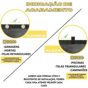 Características da tela de sombreamento: Tela com proteção u.V. Produto permeável e maleável. Fabricado com polietileno de alta densidade e matéria-prima 100% virgem, leve e possui alta resistência à tensão, compressão e tração. Bloqueia até 80% de raios uv. São leves e resistentes, fácil manuseio, transporte e instalação. Acabamentos nas laterais bainha e ilhós a cada 50 cm aproximadamente e alças nas extremidades.