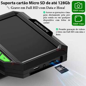 O kit acompanha um cartão micro SD de 64GB, oferecendo praticidade e espaço ideal para armazenar fotos e vídeos de inspeções técnicas com eficiência. A sonda é compatível com cartões micro SD de até 128GB, permitindo ampliar a capacidade de armazenamento conforme a demanda. É possível registrar imagens em três resoluções (1080p, 720p e 480p), ajustando a qualidade conforme a necessidade de espaço. A navegação e o gerenciamento dos arquivos podem ser feitos diretamente na própria sonda, com visualização e exclusão de conteúdos pela tela integrada. Para análises mais detalhadas, basta remover o cartão e inseri-lo em um notebook, PC ou outro dispositivo compatível com leitura de micro SD.