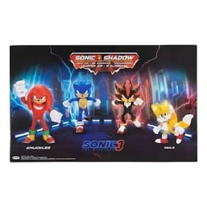 Quatro heróis, quatro jornadas entrelaçadas, reunidos em 5"" (13,7 cm) de pura energia do Sonic Filme 3. Sonic, Tails, Shadow e Knuckles ganham vida com detalhes que capturam seus traços únicos e a força de suas aventuras na tela. Cada figura revela um personagem cheio de personalidade, pronto para explorar mundos de amizade, desafios e descobertas. Com cores vibrantes e design fiel ao filme, esse conjunto transporta para um universo onde coragem e união brilham em cada passo. Um convite para reviver as emoções da saga Sonic 3, lado a lado com seus personagens favoritos. Sonic e Shadow acendem luz olhos e cabeça ao acionar botão peito .