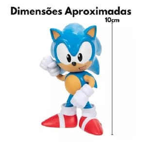 Personagem colecionável com 4 polegadas de altura em 4 sortimentos diferentes. Sonic é um dos personagens de videogame mais icônicos do mundo de todos os tempos. Junto com seus amigos Tails, Knuckles e Amy, Sonic corre pelo planeta para combater a injustiça e derrotar seu arqui-inimigo, o malvado Dr. Eggman. O Sonic é superveloz, corre mais rápido que a velocidade do som, pode se tornar uma bola para atacar seus inimigos, se auto curar em velocidades rápidas, lançar ondas de choque com o Spin Dash e criar barreiras elétricas de proteção e tem uma resistência ilimitada. E com o boneco do Sonic de 4.0 polegadas (=10.1 cm) você pode usar sua imaginação para criar incríveis aventuras. Ele possui 11 pontos articulaçoes e possui detalhes iguais ao do jogo. Acompanha acessório.