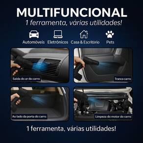 Equipado com motor de alta rotação e duas baterias recarregáveis, o soprador oferece liberdade total de uso, sem depender de fios, garantindo autonomia e praticidade. Seu formato compacto facilita o transporte e o armazenamento, tornando-o indispensável para uso doméstico, automotivo e profissional.