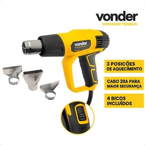 Domine seus projetos com calor e precisão Transforme tarefas desafiadoras em resultados impecáveis. Nosso Soprador Térmico Vonder de 2000W é a ferramenta definitiva para quem busca alta performance e versatilidade em seus trabalhos. Potência Inigualável de 2000W para aquecimento rápido e eficiente. 3 Estágios de Temperatura: Controle total de 50C, 350C e 550C para cada necessidade. Fluxo de Ar Poderoso: De 300 a 500 Litros/min para otimizar seu tempo. Design Ergonômico Tipo Ferramenta de aplicação: Máximo conforto e manuseio preciso. Dupla Isolação: Segurança garantida para você focar no que importa. Kit Completo de Bocais: Inclui 4 bocais essenciais para diversas aplicações. Certificado Inmetro e Normas Internacionais: Qualidade e segurança comprovadas. Especificações Técnicas: Potência Máxima: 2000W 3º estágio Estágios: 03 Temperaturas: 50C 1º estágio , 350C 2º estágio , 550C 3º estágio Fluxo de Ar: 500 L/min 1º e 3º estágio , 300 L/min 2º estágio Frequência: 60 Hz Peso: Aprox. 700g Voltagem: Disponível em 110V ou 220V Verifique a opção no anúncio Inclui: 1 Soprador Térmico, 1 Bocal Plano, 1 Bocal de Desvio, 1 Bocal de Ponta, 1 Bocal de Deflexão. Aplicações Profissionais: Ideal para moldar plásticos, trabalhos em artesanato, remover tintas antigas, instalações de PVC, aplicação de películas, e muito mais. Essencial para encanadores, marceneiros, carpinteiros, pintores e fábricas de móveis. de 6 Meses: Sua compra protegida com a qualidade Vonder. As imagens são ilustrativas e podem apresentar pequenas variações. Este produto é protegido por direitos autorais. Qualquer reprodução não autorizada estará sujeita às penalidades legais. Marca: Não Informado
