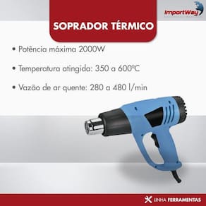 Com o Soprador Termico da Importway pode-se realizar trabalho como colagem de Plásticos, Aquecimento de Materiais, Remoção de Pinturas, Soldagens, Descongelamento de Tubulações , aplicação de termo-lacre, envelopamento de veículos, Artesanato, Linha Automotiva em Geral aplicações em geral.