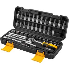 1 Jogo de soquetes e ponteiras composto por 46 peças, sendo: 13 soquetes sextavados de encaixe 1/4" (4 mm, 4,5 mm, 5 mm, 5,5 mm, 6 mm, 7 mm, 8 mm, 9 mm, 10 mm, 11 mm, 12 mm, 13 mm e 14 mm), 6 soquetes hexagonais de encaixe 1/4" (3 mm, 4 mm, 5 mm, 6 mm, 7 mm e 8 mm), 3 soquetes bits fenda encaixe 1/4" (4 mm, 5,5 mm e 6,5 mm), 3 soquetes bits phillips encaixe 1/4" (PH1, PH2 e PH3), 2 soquetes bits pozidrive encaixe 1/4" (PZ1 e PZ2), 7 soquetes bits hexalobulares encaixe 1/4" (T10, T15, T20, T25, T27, T30 e T40), 1 adaptador tipo joelho encaixe 1/4", 1 extensão flexível de encaixe 1/4" (150 mm), 1 adaptador para bits 1/4" x 1/4", 4 chaves allen (1,27 mm, 1,5 mm, 2 mm e 2,5 mm), 1 prolongador médio de encaixe 1/4", 1 prolongador pequeno de encaixe 1/4", 1 catraca encaixe 1/4", 1 cabo T encaixe 1/4", 1 cabo adaptador quadrado de 1/4". Acompanha maleta plástica.
