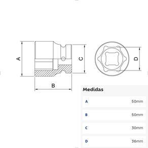 Os soquetes de impacto da Tramontina PRO são produzidos com sistema Hyper Drive que melhora o acoplamento do produto ao parafuso ou porca, reduzindo as tensões geradas no aperto e prolongando a sua vida útil. Ref.: 44880/136. Marca: Tramontina. Forjado em aço cromo molibdênio e temperado. Acabamento fosfatizado. Perfil Hyper Drive (de cantos arredondados). DIN 3129. Um grande avanço na produção dos soquetes é a introdução do conceito ''Hyper Drive''. Este novo perfil melhora o acoplamento do soquete na porca ou parafuso, reduzindo as tensões geradas no aperto, prolongando a vida do soquete e do elemento de fixação. Os soquetes são submetidos a testes rigorosos de torque e de dureza para atender a norma DIN 1711-1. Os soquetes de impacto são produzidos com um aço ligado com cromo e molibdênio (Cr-Mo) na composição. Isto garante, após o tratamento térmico, uma maior resistência ao desgaste se comparados aos soquetes normais. Por isso, são os recomendados para a utilização com parafusadeiras elétricas ou pneumáticas. Afrouxar e apertar parafusos sextavados utilizando parafusadeiras pneumáticas. Amplamente utilizado na indústria de montagem e desmontagem de motocicletas. As ferramentas são produzidas e testadas conforme normas específicas. Tamanho: Comprimento (A): 50mm. Largura (B): 50mm. Altura (C): 30mm. Encaixe (D): 36mm. Peso: 0,32kg.