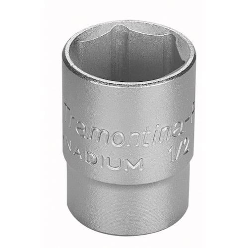 Os soquetes da Tramontina PRO são produzidos com sistema Hyper Drive que melhora o acoplamento do produto ao parafuso ou porca, reduzindo as tensões geradas no aperto e prolongando a sua vida útil. Escolha o tamanho e perfil ideal para a sua necessidade e mãos à obra. Orientações Um grande avanço na produção dos soquetes é a introdução do conceito "Hyper Drive". Este novo perfil melhora o acoplamento do soquete na porca ou parafuso, reduzindo as tensões geradas no aperto, prolongando a vida do soquete e do elemento de fixação.Soquete forjado em aço cromo vanádio e temperado. Acabamento cromado. DIN 3124. Os soquetes são submetidos a testes rigorosos de torque e de dureza para atender a norma DIN 1711-1.Afrouxar e apertar parafusos e porcas sextavados.As ferramentas são produzidas e testadas conforme normas específicas. Observações Use óculos, luvas e outros equipamentos de proteção individual (EPIs) de acordo com a tarefa a ser executada. Selecione o tamanho do soquete conforme a bitola do parafuso ou porca. Para operações com parafusadeiras pneumáticas ou elétricas, use soquetes de impacto. Inspecione os soquetes antes de sua utilização. Soquetes que apresentam trincas ou desgaste excessivo devem ser substituídos. - Armazene em local limpo e seco. Características Gerais EAN13 7891114133080 DUN14 17891114133087 NCM 8204.20.00 Peso Líquido 0,1600 kg. Peso Bruto 0,1600 kg. Metragem 0,000200 m³. Dimensões Embalagem (Compr. X Larg. X Alt.) 100x 50x 40 mm. Dimensões Produto (Compr. X Larg. X Alt.) 42x 34x 34 mm. Dimensão Extra A 33,2 mm. Dimensão Extra B 42,0 mm. Dimensão Extra C 31,0 mm. Dimensão Extra D 25,0 mm.