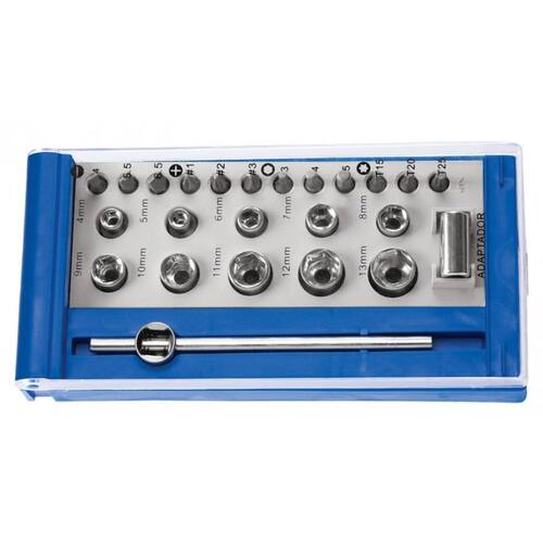 O estojo contém 10 soquetes nos tamanhos: 4, 5, 6, 7, 8, 9, 10, 11, 12 e 13 mm. Também inclui 1 Cabo T 1/4 e 1 Adaptador de 1/4. Além disso, acompanham o estojo 12 ponteiras, sendo 3 pontas chatas nos tamanhos: 4, 5.5 e 6.5 mm, 3 pontas cruzadas nos tamanhos: nr.1, 2 e 3, 3 pontas hexagonais nos tamanhos: 3, 4 e 5 mm, e 3 pontas trafix nos tamanhos: T15, T20 e T25.