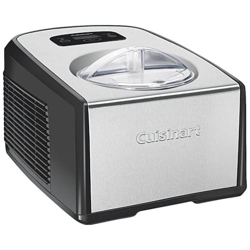 Sorveteira automática Cuisinart ICE 100 com compressor, capacidade de 1,2 litros, duas pás de mistura, temporizador de 60 minutos com controles touchpad, display LCD, ciclo Keep Cool de 10 minutos e componentes livres de BPA.Bowl de congelamento