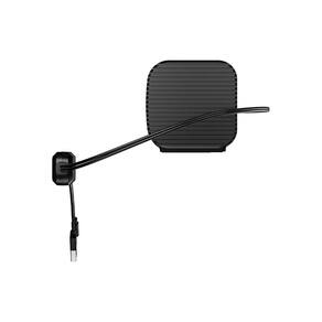 Sistema 2.0 Estéreo, Design Compacto, Alimentação USB, Conexão P2 (3.5mm), Controle de volume integrado no cabo.Demonstração 360º