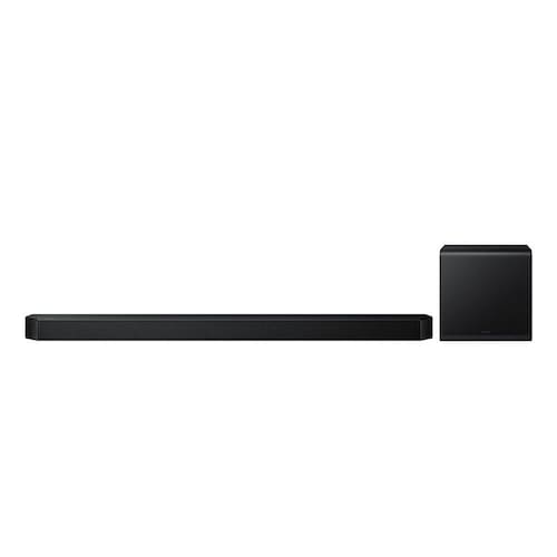 A Soundbar Samsung Serie Q 2025, 5.1.2 Canais, Subwoofer - HW-Q800F eleva o entretenimento da sua casa com um sistema potente de 5.1.2 canais e tecnologia Dolby Atmos sem fio, proporcionando um som cinematografico imersivo com alto-falantes fisicos superiores e laterais que preenchem todo o ambiente.
