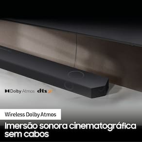 Produto:Soundbar Samsung HW-Q800C, Bluetooth, Subwoofer sem fio, Dolby Atmos Marca:Samsung Modelo:HW-Q800C/ZD Garantia:12 Modelo:Soundbar Origem:Importado Número de Canais:5.1.2 ch Número de Speakers:11 Speaker:Sim Tipo de Subwoofer:Wireless Dolby Atmos:Sim DTS Virtual:X:Sim Som Surround:Sim Dolby Digital 2.0:Sim Inteligência de som antiruído:Sim Sincronia Sonora:Sim Toque em Som:Sim Modo Game Pro:Sim Equalização Automática:Sim AAC:Sim MP3:Sim WAV:Sim OGG:Sim FLAC:Sim AIFF:Sim HDMI Entrada :1 HDMI Saída:1 HDMI ARC:Sim Entrada Óptica:1 USB Music Playback:Não Controle Remoto:Sim Bluetooth:Sim Wi-Fi:Sim Bluetooth sempre ligado:Sim SmartThings:Sim Bixby:Não Assistente Virtual:Sim Google Assistant:Não Chromecast:Não Spotify:Sim AirPlay:Sim Dimensões da embalagem (LXAXP):1182 x 576 x 272 mm Peso Bruto (Embalagem):18 kg Dimensões da Barra (LXAXP):1110,7 x 60.4 x 120 mm Dimensões do Sub Woofer (LXAXP):210 x 403 x 403 mm Cor:Preto Peso líquido (barra):5.1 kg Peso líquido (Sub Woofer):9.8 kg Consumo da conjunto em stand-by:0,5 W Consumo do Subwoofer em stand-by:0,5 W Consumo em operação da Barra:39 W Consumo em operação do Subwoofer:28 W Bivolt:Sim Energy Star:Não Suporte de Parede :Sim Baterias (para controle remoto):Sim Manual do Usuário:Sim Cabo HDMI:Não Cabo USB:Não HDMI CEC:Sim Bluetooth Multi Connection:Não NFC:Não Space Fit Sound:Sim Condição:Novo Fabricante:SAMSUNG ELETRÔNICA DA AMAZÔNIA LTDA