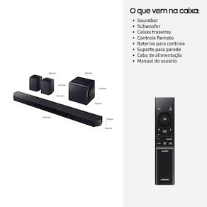 Soundbar Série Q HW-Q990F 11.1.4 canais com Subwoofer e Caixas traseiras. Tecnologia Dolby Atmos sem fio, Q-Symphony, SpaceFit Sound Pro, Amplificador de Voz Ativa Pro (AVA), Equalização automática, Modo Game Pro, Controle dinâmico de graves, Som privado para caixas traseiras, Agrupamento Sonoro. Conexões HDMI eARC / HDMI 2.1, Bluetooth e Wi-Fi.Demonstração 360º
