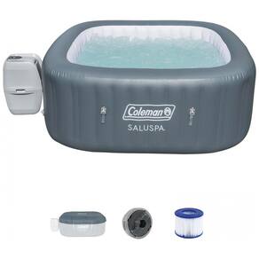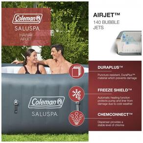 BANHEIRA DE HIDROMASSAGEM INFLÁVEL: A banheira de hidromassagem inflável Coleman SaluSpa é feita para até 4 pessoas e aquece rapidamente a relaxantes 40 graus Celsius com 114 jatos de ar ao redor.