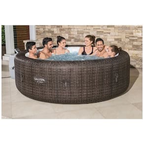 A banheira de hidromassagem Round St. Moritz oferece uma experiência de massagem relaxante com 180 jatos quentes borbulhantes para até 5 a 7 pessoas e atinge até 40 graus Celsius para um relaxamento máximo.